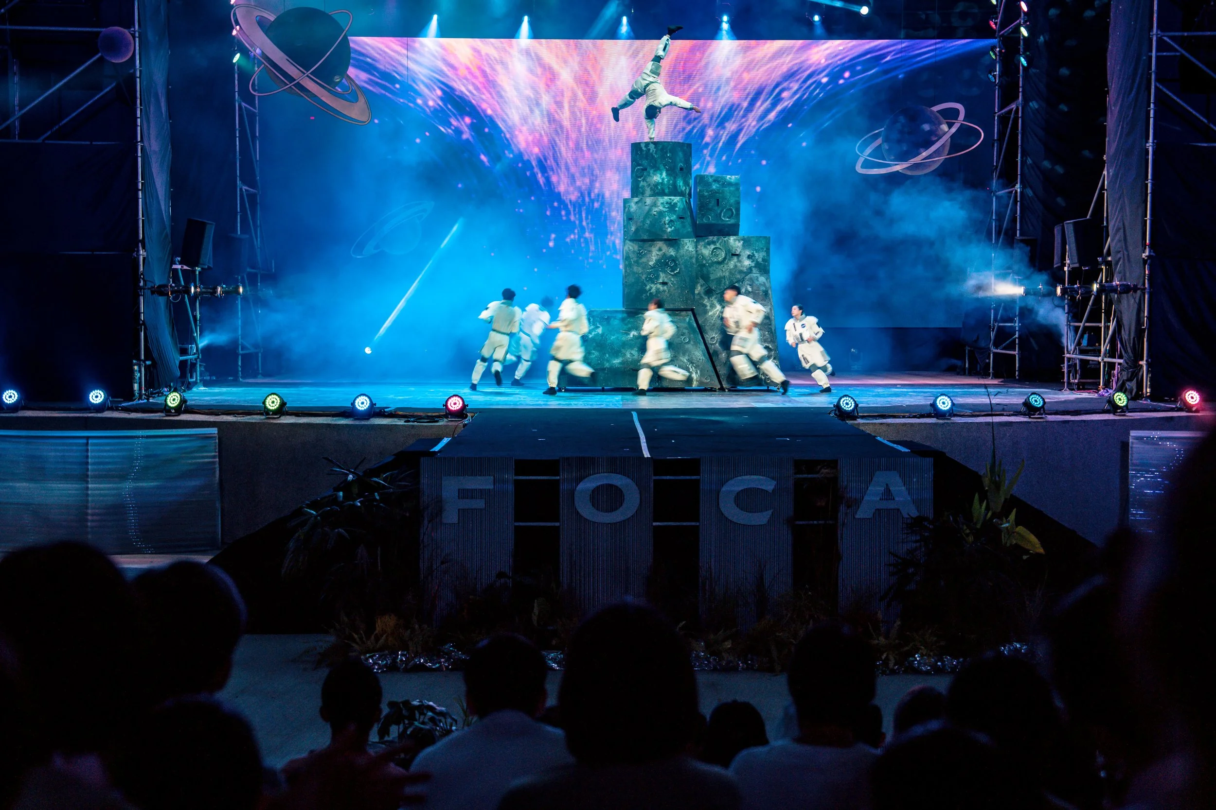 FOCA福爾摩沙馬戲團《宇宙大冒險:夏夜魔幻派對》,結合馬戲、沉浸式裝置與四四拍唱片行,打造太空主題演出。透過體驗與市集活動,探索星際旅程。(圖片來源:FOCASA馬戲團)